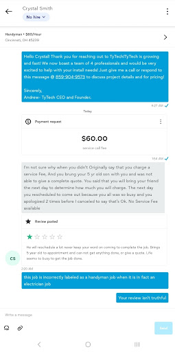 I did nothing to deserve a 1-star review. You stated you needed a simple chandelier hung where an existing light fixture was. I get there to find out its 3 chandeliers and you wanted me to also add dimmer switches/ separate them from the fans that were also wired to the same switch. Significantly different than I was led to believe. I was straightforward and said i needed to consult with my friend, who was an electrician. He had something come up, so i needed to reschedule a single time. Hardly rescheduling "a lot"