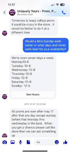 I do not take leaving a bad review lightly but I feel other brides should be warned so they don’t waste their time here. I 100% do not recommend this shop. They should not be advertising as a bridal shop because they refuse to allow you to come try on wedding dresses. Over a 3 month span I have tried to make an appointment 4 different times and was refused an appointment every time. I have been nothing but patient with them every time they told me no. My 3rd attempt at making an appointment I finally asked them when would work for them to get an appointment and was told any day except Sundays after May 17th so I waited as requested to call to make an appointment for the 23rd and yet again I’m told no. When I told them we have been trying for months they had zero care. My daughter has put off dress shopping for months waiting on this place and for them to show such disregard to us is as unprofessional as it gets. Needless to say we will be taking our business elsewhere and I highly recommend you do not waste your time with this place. They have zero care or respect for brides. **Edit based on their response making it sound like I was being impatient or unreasonable which is 100% not the case. The fact that we waited for months trying to get an appointment should show we were more than patient and understanding with them as they kept telling us no to every appointment attempt. I’m adding pictures of my attempt to make an appointment and you can see their response telling me ANY Day after May 17th. All other communication was over the phone. I find it extremely unprofessional to attempt to put this back on me. If they are not willing to do bridal appointments for several months then they should put that out there and be honest from the beginning. Had they said we don’t do bridal February thru May then we would have respected that and immediately found another bridal shop but that was NEVER said. I also want to add the message I attached below was the only time I asked about an appointment that would be considered late notice and I asked about coming another day as you can see in the message. All other attempts were phone calls at the beginning of the week asking about an appointment for the weekend. I am happy to say we did find a real bridal shop that was very accommodating and professional right from the start. I highly recommend a bridal shop located near Unusual Junction in West Lafayette, google it you won’t be disappointed. They have huge selection of wedding and Prom dresses and they were amazing to work with. They are very responsive and treat every customer with kindness...