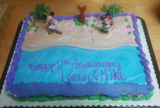 Read moreWe ordered a cake for our anniversary a few weeks in advance from here. We don't live in the area, but made a special trip since we would be renting a lake house when we got the cake. We wanted the cake decorations that were on the sample design cake and not in the book. They were unable to order them, but offered to take the decorations from the sample cake. My husband did not pay much attention to the cake when he picked it up, but once he arrived with it my friend and I immediately noticed the border. The top and sides of the border were the normal pretty design, but the bottom looked like a long blue turd. They had used a simple round applicator and done nothing to make it look nice. I used a butter knife to try and smooth it down, but you can see the difference in the borders. The cake tasted good and aside from the bottom border was beautiful, but the bottom border... It...