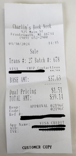 These people are thieves!! They steal from you twice!! So the books I chose to take were total $35, but when I got the receipt it was showing $39.14. So they theft me $4.14 on that transaction and when I saw the amount I turned back to ask explanations they said that $1.51 is for the credit card fee but there is saying dual pricing!! Yes it is dual pricing indeed!! And I told them you should tell me before, so I can use cash, or not buying at all to you and she responded you can see the notes through the shop, but there is NO NOTE on the shop mentioning the credit card fee. Also the amount instead of showing $35 for the books I took, it is showing $37.63!!!! I asked them that they need to do the math again because there is $2.63 more. And they responded that difference is for the taxes but that is a lie, because otherwise it will show there as tax fee as all the purchase receipts show in all the correct merchants receipts. So they not only gain so much by having free books from people and organizations and selling them with a VERY PRICEY amount, but they also gain by thieving the buyers! I regret it so much that I didn't give them the books back and to have my money back!! But for sure will never go there again to buy something and I will also file a claim to the Michigan Consumers Bureau. Is not that I went poor by doing that purchase, but what it doesn't belong to them it doesn't and they are not supposed to charge me as...
