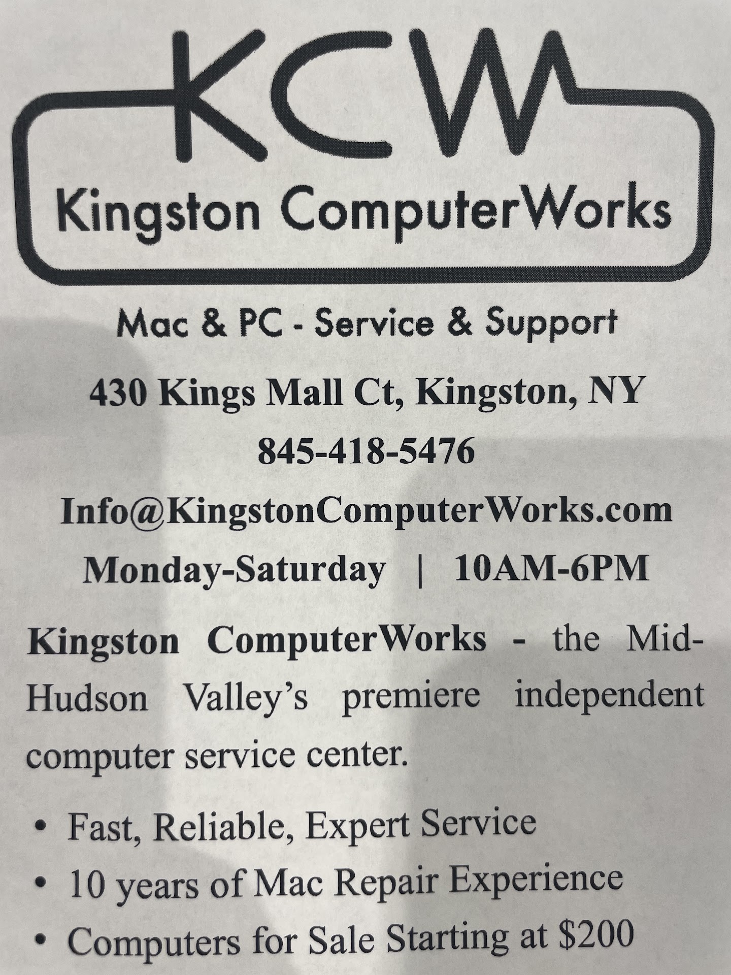 Yes! I finally found the Mac wizards I’ve been seeking since moving to the Hudson Valley. Just a few superlative perks Matt & Forest offer besides highly competent expertise: Patience to understand & solve even poorly articulated requests from non expert users. I watched this young tech be kind and thorough helping the (even older and dumber than me) customer ahead in line. On and Beyond: It was like my old Mac got a spa treatment and face lift for an incredibly reasonable price. They had it done & ready to pick up two days faster than estimated, and made sure everything was exactly right at pick up. It wasn’t. It was my fault, cost them extra time and no one got impatient with me. I’m in awe of this level of service and can’t recommend KCW highly enough. Oh, and easy parking behind the building right in the busy Uptown area of Kingston with a great book/coffee shop across the street. Who knew computer issues could be a satisfying experience? A...