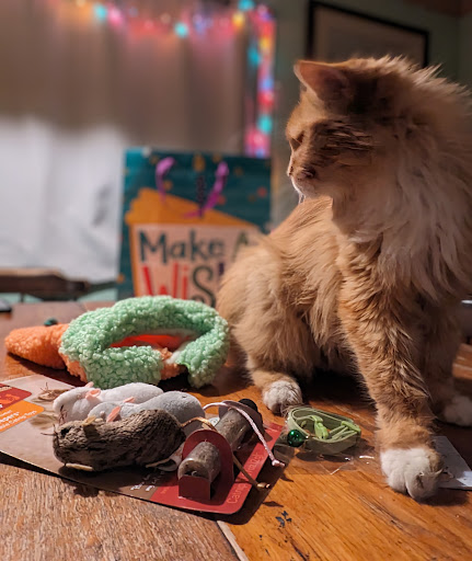 Small shop owners are some of the best people to interact with. While shopping for our granny cat's birthday - we were overjoyed to see the carrot sweater in question. A long while ago, we had bought her the eggplant sweater. So, with a new sweater idea in mind to fit Fluffy's orange fur, we lucked out! Apparently the shop owner shared with us that these pet sweaters are hard to judge. Yet, I would like to argue they are better than the ones at chain pet stores because of the buttons. Additionally, the shop owner was surprised to hear that Fluffy is going to be 26 years old this year. We're always happy to find someone else who is excited for fur babes ! Fluffy thanks you for the gift! She wore her carrot for to celebrate the spring 🌼