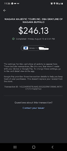 Read moreThe “tour” provided is definitely not worth the money. My husband spent $250 on this tour for just him and me. We were told we would get tickets to the major tourist things at the falls (maid of the mist, cave of the winds, etc), a stop for lunch, and opportunity for some shopping at gift shops.