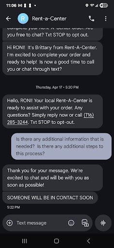 Read moreI've gotten a few things from them and been satisfied every time. Last year I got a fireplace that came to me with a door falling off. I did same as cash so it was paid off in the 90 day time frame. A different manager was there at the time of my purchase and promised he would replace it but we had to wait until the fireplace came back in stock this season. The new manager, a young lady, made sure I still got a new fireplace to replace the broken one that was sent to me. And it's much nicer then the one I paid for. Thank you so much. And y'all know your going to keep getting my money. Just ordered a new living room set to go with the new fireplace....