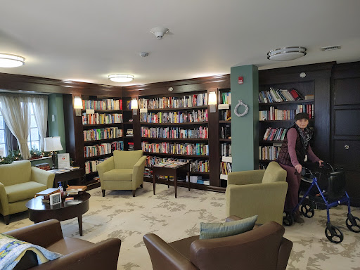 The building itself is beautiful and has new windows. You feel like you're in a castle. Everything feels homey. There's a shared library, kitchen, dining room, laundry room, and private rooms. All needs are met. Mymom could even go in the kitchen and bake cookies in the middle of the night if she wanted. There's free meals and pet therapy. All needs are met at all times.