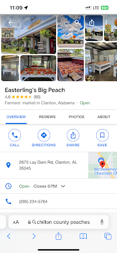 Stopped by this morning for plums and peaches. Employee said no more plums, season is over. Did get a basket of peaches ($6/6 big peaches), which are juicy & taste good. I was very surprised though to find a sticker on peach saying it's from South Carolina. Guess it's my fault for assuming that the stand was selling ones from Chilton County. To their credit, I did look as drove back by the stand later today, there wasn't any noticeable signage claiming they were the famous ones grown in Chilton county. Just so you know, in case you're travelling to the area in...