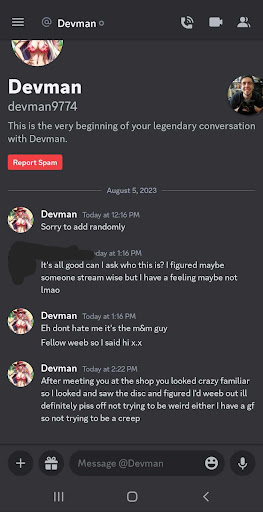 I am deeply troubled by the conduct of an employee named Devon at M&M Games. Despite providing personal information such as phone numbers and names to the shop for account purposes, Devon used this information to stalk my wife online. He proceeded to add and message her on Discord not even an hour after our visit, a matter I have documented with attached photos.