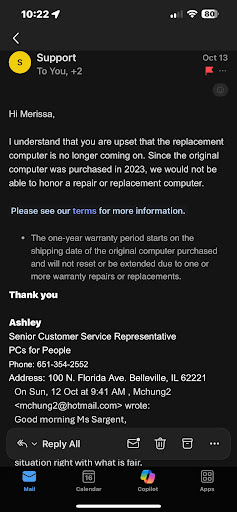 TLDR- company sent a replacement Laptop for one they lost and the replacement stopped working in 5 months. Company refuses to replace. (See screenshot of their response. Sorry I’m upset-lol)