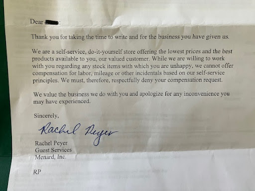 I went into the Clive Menards store, asked for a manager and I was told the General Manager would speak with me. A lady named Michaella (Spelling may be wrong) arrived and I informed her of my issue. She was polite and calm but showed zero sympathy. Below is a summary of our conversation: Michaella stated they cannot refund anything related to labor or materials. I stated per this letter, Menards is assuming every product they sell, the owner is assumed to know how to install it. Michaella stated, "We are a do it yourself store, but we don't assume you know how to do it all yourself". I replied, "So I am out the $380.00 because I don't know how to install the vanity and did not see the it was broken beforehand?" Michaella stated if I had to broken vanity with me, maybe a discount could be added but since my current vanity is installed with no issues (I informed her of this earlier), nothing can be done. As I stated earlier, I was told I could not bring in my broken vanity until my new one arrived, so there was no way for me to get a discount. Whether Michaella knew this or straight up lied to me, I don't know, but I will assume she did not know.