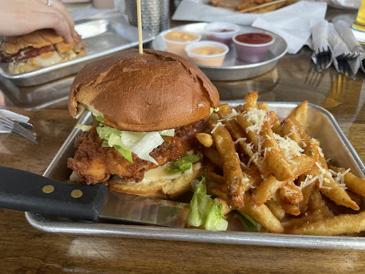 We were pretty hungry when we land to the wolf house brewing after a 4 miles hike to Armstrong national forest, so heavy burger is always my choice. we order Porky's Revenge, French dip, and I go for the fried chicken sandwich AKA "Dirty bird". I know French dip is going to be a bad choice when I see the keywords "Tri-dip" and I believe dirty bird means it will be very saucy. I enjoy saucy with the fried foods. my poor friend, and I hope he got a strong jaw.