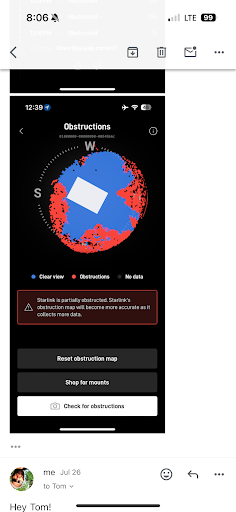 Tom, installed it on the roof of my cabin instead. I didn't know much about how this worked but he assured me my speeds are high. I tested it and it worked. However, shortly there after I realized my Internet was fast when it was connected but dropped because of the trees every few minutes for 60+ seconds. So emails didn't go through. Work calls couldn't happen. The reason I had Starlink installed was pointless.