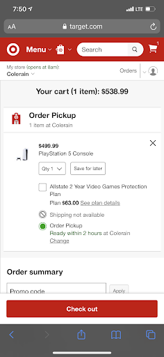 Read moreI have been trying to obtain a PlayStation 5 for months now. I spent all of this morning refreshing Target's website when I finally saw that they were in stock. I added the console to my cart and began the checkout process. My credit card info and store pick up location (Colerain) were entered as well. I clicked the "Place Your Order" button and was greeted by a "High Demand Item" message that essentially told me to keep trying to check out due to multiple guests trying to check out at the same time. All of the sudden..... a "Cart is empty" message appears. My item was taken out of my cart without my approval. The item was now out of stock. I spoke with a Dillon @ the Colerain location in electronics (very polite and understanding) who essentially agreed with me that this is a common problem with Target and their website. I was advised to call corporate, who in turn would get it cleared up. I eventually reached a Kevin who was a senior specialist. I was told that Target could do absolutely nothing to make this issue right. This is also a common issue among many other people that I have noticed after reading reviews. Once you secure something in your cart to check out, it shouldn't be possible for that to be taken away from you. From the moment that I added the item to my cart to the point that I clicked place order was no longer than 2-3 minutes. I never walked away from checkout during the process either.
