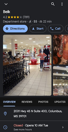 On May 28th, my husband and I went to Belk in Columbus MS. My first encounter with an employee was less than pleasant. I simply asked her if the signs over the clothes notated "only said $19.99" would the coupon apply, her answer was, you will just have to wait until you check out. Turns out every rack was "door buster" but not all racks in the Kim Rogers women's dept. were notated as such. My husband had a much more pleasant experience in the shoe dept. Kaylene, was awesome. She offered to order him a pair of shoes, but he declined. She also rang me up and scanned all the coupons to see which one would benefit us the most. 3 hours later my husband decided to go back and order the shoes, so I went to the bathing suit dept. I haven't bought a bathing suit in years, so I truly had no idea how the sizes ran. BIG MISTAKE! I asked a clerk what the equivalent sizes were between an X and an XXL, her reaction was so d*mn rude I almost cried. She got right in my face and said " I don't know" ! Really, can no one tell me if an x is 20 or an XL is 22? I thanked her for her time and was sorry I bothered her. Then I put the items I had planned to purchase , back on the rack.