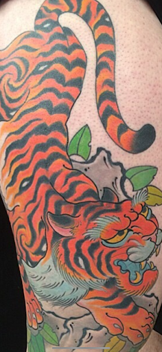 PHOTOS : the tiger photo is freshly taken from 2014. The purple lotus flower sleeve photo is from 2021. The yellow-orange peony flower chest plates were finished and...
