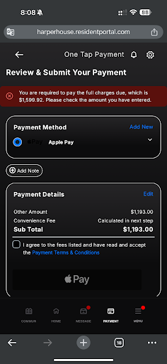 First of all, the payment system has become unnecessarily complicated and restrictive. Until recently, I was able to split my rent into two payments without any issues, but now management has decided to post the balance on the 25th instead of the 1st, forcing a full payment in one transaction. This is highly inconvenient and not in line with the lease agreement, which clearly states that payments can be made until the 3rd of the month. Instead of improving the system, this decision only creates frustration for residents.