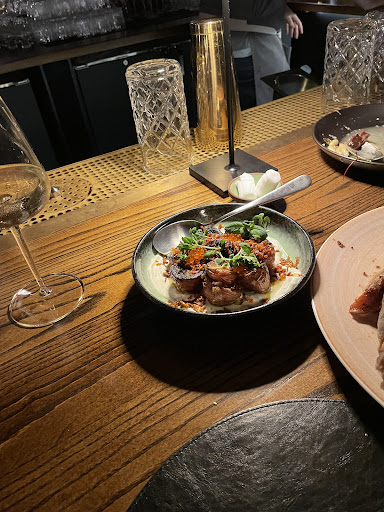 The restaurant is great. There are four areas to dine: upstairs there is a bar area and a small dining area. This space is clean and nice but I think the real magic is downstairs. The downstairs dining area feels like entering into a speakeasy hideout. There is a bar area with a low ceiling and dark painted walls which adds to the cozy vibe. We ate at the bar and it was nice but I did find the chairs in the bar to be a little uncomfortable after an hour or so. The downstairs dining area is a bit more dynamic with a chefs table a higher ceiling and some tasteful art on the wall. There are four private bathrooms Downstairs which are all really beautiful.