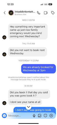 The owner, Marcus, is highly unprofessional and unreliable. I booked a 4-hour session two weeks earlier. On the scheduled date and time, twenty-seven minutes before our appointment, he sent me a DM and text to cancel. I was on my way driving, so I didn't see the text.