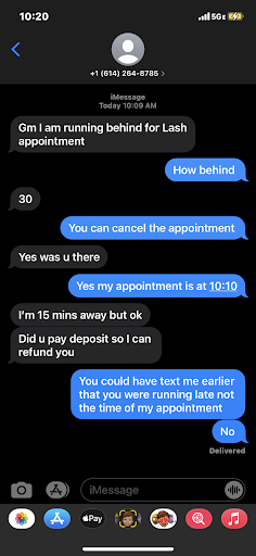 Read moreI was supposed to have an appointment at 10:10, and Bri text me at 10:10 saying she was 30 minutes late. Of course I was at the shop on time, if you’re running late that’s something you communicate before the appointment time. I’m not waiting 30 minutes when it took me 30...