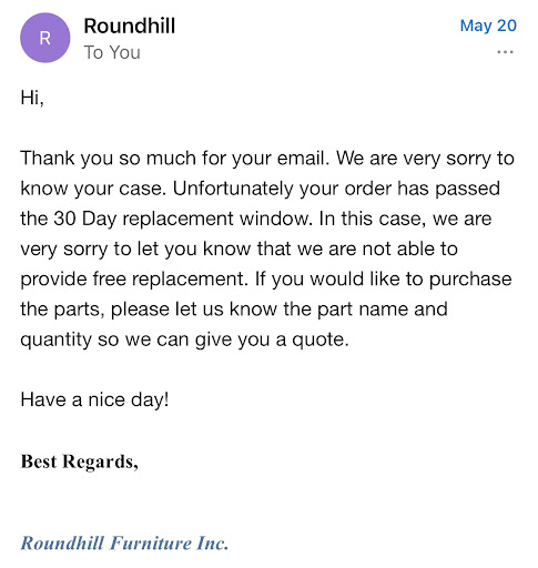Unfortunately, Roundhill Furniture does not stand behind its products. I’ve spent the past week emailing back and forth asking for a replacement table top or a partial credit to account for the fact that there is a small crack in the center of the table but the company refuses to work with me. They continue to try and give the run-around with excuses like, “we can’t give a partial credit, you’ll just need to return the whole table.” We spent four hours putting the whole thing together, so that isn’t a viable option.