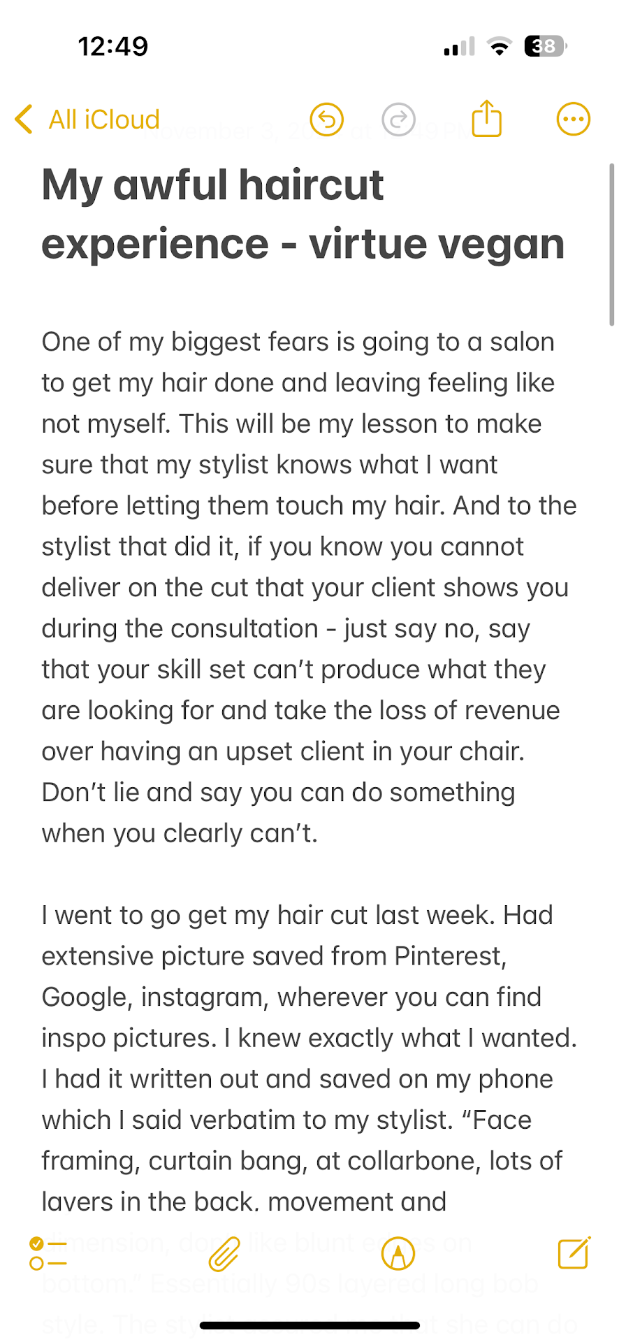 I am one of those folks who never leaves reviews, but I am still reeling from my appalling experience today. I booked a last minute appt (12:00 booked 8:00) and was excited to see that it was with a stylist Iâve had in the past and loved. Admittedly, I have recently been visiting a different salon because financial stresses have forced me to prioritize and I simply got priced out. But after a truly awful haircut, and a period of stress that has left me needing to do some self care, I decided to splurge and return to a stylist I trusted.