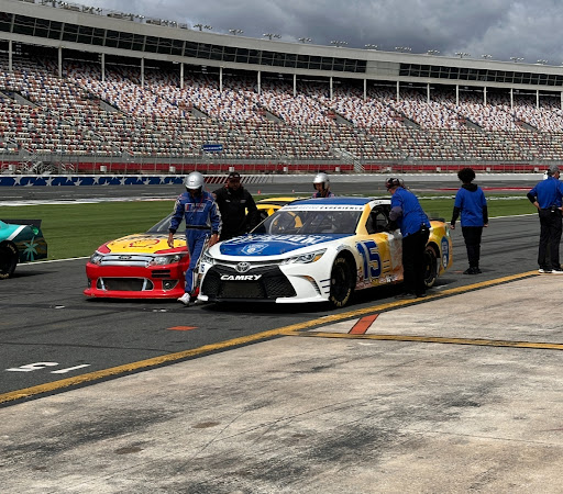 Once we were at the track we saw that there was a rather large company function of at least 30 people waiting around to drive. My husband didn’t get to a car for 2 hours! In my opinion this was very poor time management on NASCAR’s part. Our reservation time should have been later due to the rather large group ahead of us. We just sat on the side in sweltering heat waiting with no fans or fresh cold water. This was miserable and disappointing. Even made me kinda sick from being so hot.