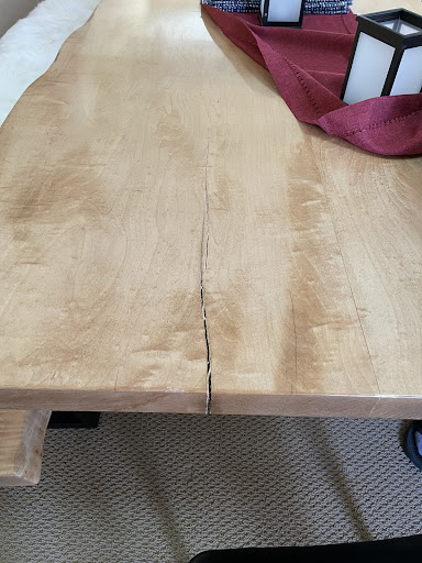 September 2021 I contacted owner Jamie Holcomb whose workshop is in Smithfield Rhode Island. By October 29, 2021 we chose rock maple wood for a custom, live edge dining table and made a deposit of $1500. On November 1st, 2021 I paid the remaining balance of $2449. per Jamie and he would begin the job. Paid in full. The table was delivered on December 22, 2021. On April 30th, 2022 I contacted Jamie with pictures of a long crack splitting the edge of the table. I was devastated and shocked considering the table was brand new and hardly been used. Jamie said this sometimes happens with natural wood and he would take care of it.
