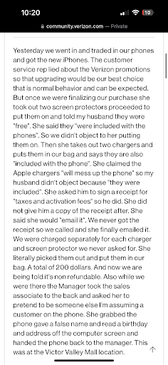 I am going to have to post this here and anywhere else I can until I am given a proper refund. I went into this location to get two know galaxy s10s. Bianca was the sales associate. She gave us multiple cell phone accessories as part of an "instore promotion" they were free with the phones her exact words although they aren't trained to use the word "free". After paying off my phone $280 so that I could upgrade I also added a line. Bianca stated that we still owed another 300 dollars because the new line phone required a "large down payment" my gf questioned it and me being the nice one trusting the associate said no that's probably right so we paid. 3 days later I check my Verizon account and see that there was no down payment placed on the phone which then made me look at my receipt thoroughly. Bianca had charged us for all of the accessories she stated where free. I guess she figured we were black and weren't educated enough to put two and two together. So we go back to the store after not getting anywhere with the manager over the phone. After about 3 hours of debating Dan the manager puts in for a corporate check this is March 22nd. It is now April 26th and we still have not received our refund after my gf witnessing someone getting a refund in store on yesterday April 25th while trying to inquire about the check for the umpteenth time. Now all of a sudden the check was sent 3 weeks ago after no one knowing anything for two weeks. I have been with Verizon for years, I have never dealt with anything more discriminatory then this. I am still waiting on a refund, as no check was received by us nor cashed by us & the story of the check keeps changing every time we talk to the manager. Terrible experience and until it is addressed in the correct manner I will make sure it's noticed. Since my gf initial review the associates have already said that other customers have come in with the...