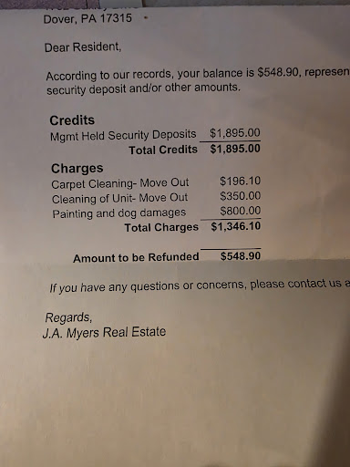If you are looking for an honest company run far far away from JA Myers. (Very long post but worth every word for anyone considering either purchasing or renting from this company). This is in regards to a rental however this applies to them as a company and they conveniently have no place for public reviews about their specific rentals. We lived in a rental property for 3 years. We maintained our home with respect to the property and raised 3 children. We did not abuse the unit beyond normal wear and tear and the most permanent thing we altered was adding non permanent 3M child safety pulls in our cabinets to keep our children out of hazards which was not against our lease. We have always carried excellent rapport with all previous Landlords. We decided to terminate our lease early because we were purchasing a home. We agreed to the terms in the lease when it came to breaking a lease and understood we would pay a penalty. We hired a professional carpet cleaning service as requested in our lease to clean our carpets. JA Myers (Caleen Holmes acting on their behalf) stated she was not happy with the job and stated she smelled an odor so we had the carpet cleaning company come back out again (they did a fantastic job) the carpet cleaning company stated they did not identify an odor and felt as though the property manager was being unreasonable and difficult. After they cleaned the carpet again as requested, JA Myers (Caleen Holmes) stated that they would charge us for a full carpet replacement. It was reported to us by the carpet cleaning company that JA Myers had called this professional carpet company to âget their stories straight and get on the same sideâ should we take JA Myers to court. They proceeded to charge us in excess of $7,000+ for move out costs such as painting the unit. The paint was ordered and delivered to the property before we even had a move out inspection. There were various other charges that we felt to be inaccurate and inflated. Upon asking for receipts for these charges they refused to give us any proof of these charges. We also asked in general about some of these charges and were completely disregarded and not given a response. They then tried to get us to not only pay this amount but sign a NON DISCLOSURE CLAUSE agreeing not to discuss further confirming our suspicions of their sneaky work. When we agreed to payment against our gut but refused to agree to the non disclosure clause they slipped in there JA Myers (Caleen Holmes) stated that they would take us to court and any payment agreement was terminated. This was AFTER we paid them $2,000. When questioning them as to why they put that clause in there they refused to comment. They to this day refuse to support any of these charges with receipts stating that âlegally they donât have toâ. We stated that we were in agreement to pay should these charges be valid and we simply wanted to see where the numbers were coming from and that the work they were claiming was actually completed and not fabricated. This is a small amount of many issues and inconsistencies from this company. There were also work orders that we placed for items breaking in the home that were never fulfilled until the week we were moving out (more than 6 months after the work order was placed). They will lie and they will misrepresent things to get money and will back you in a corner by threatening to take you to court if you question ANYTHING. Thoroughly read your contracts REGARDLESS of what they tell you or say because they will say anything to you to get you to sign on a dotted line and then will go back and deny anything they said and tell you to look at the contract you signed. This business is not run with integrity at all....