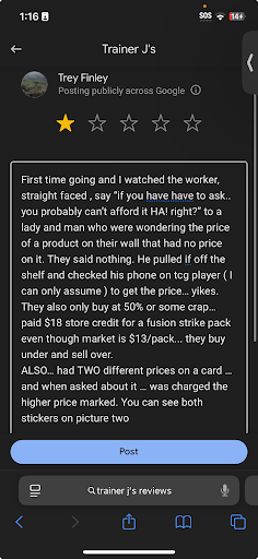 Read moreI came into the store for the first time yesterday to sell or trade one of my graded, green ninjas and they offered me 150 after telling me it’s selling for or 270 ( on price chart) I understand that you have to buy low and sell high but $150 for $270 card is ridiculous. Not only that but a couple came in while I was at the counter and the lady asked one of the store workers the price of something on the wall. (Because she couldn’t see the price tag) and the worker said “if you have to ask you probably can’t afford it. That’s COMPLETELY unprofessional. Keep in mind this is my first impression of this store. Aside from all that they are scalpers just reselling at a physical store. I respect the hustle tho but I will not be giving them anymore of my business and I’d advise you...
