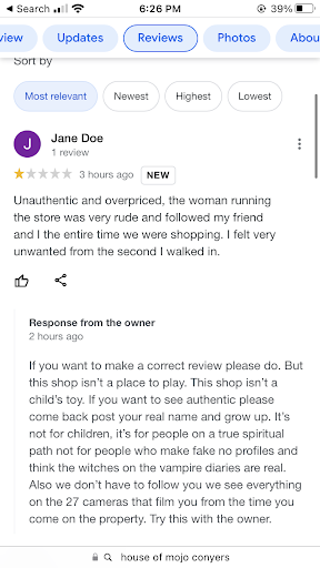 If I can give 0 stars I would. I am here to help the next spiritual being. I have never been to Wicked Mojo before. I always go to crystal blue or Phoenix and dragons. However, I live in Conyers and I need something for a ritual and did not want to drive 30 mins to those other stores. Now, I wish I did.I arrived at wicked mojo this morning waiting for 30 mins until the store opens. I parked my car behind a jeep. I assumed it was another customer waiting for the store to open, so I parked behind it. Now mind you, the parking lot is really small and I did not know where to park. 5 mins before the store open, this lady got into a Jeep and proceed to back up on my car, so I backed up because I did not want to get hit. Next, a lady comes out the jeep and rudely told me to park my car in the parking lot. She was extremely rude and exude negative vibes. Out of curiosity, I asked what her name is and it was Raven. The Raven that has been on everybody's 1 star review. She proceeded to use profanity and spew negativity towards me. In result, I drove off and she proceeded to chase me. I called the store a few mins later to speak with the owner and I found out Raven is the owner and hasn't taken her medicine. I was also told she is going through a lot and that's why she was so rude and wicked towards me. I completely understand that, However that is not an excuse to be nasty towards a potential customer. PLEASE DO NOT SPEND YOUR MONEY HERE. DO NOT GIVE YOUR MONEY TO RAVEN. PLEASE DRIVE 30 MINS TO CRYSTAL BLUE OR PHOENIX AND DRAGON FOR ALL YOUR CRYSTAL AND SPIRITUAL NEEDS. Lastly, if you noticed all the 1 star reviews have a negative and rude response from the owner. That is your proof that this is not a good store to shop with. I am 100% sure the negative responses are from Raven. I am sure she will leave a negative response to me because she is miserable and rude. Raven, I prayed for you and you need to do better.