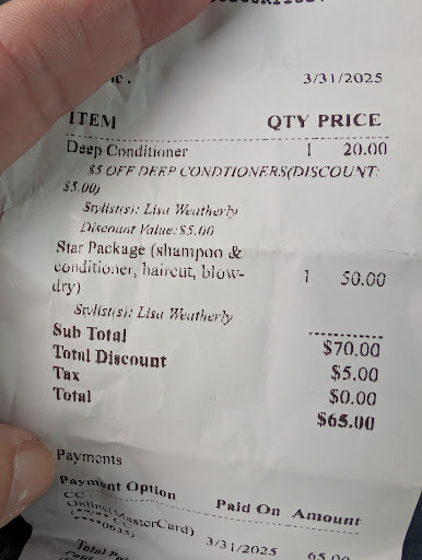 If I could leave a negative rating I would. This was by far the worst experience I have ever had at any salon. I went in asking for a perm. Showed her pictures of the type of curl I was looking for. I told her that it had been colored. She looked at my hair and said yea let’s do it. I’m like ok great. She used the purple rollers which looked too small to me. And they were. She takes the rollers out and of course my hair was damaged and faded. Which I knew was a possibility. But it was getting down to the cut that got me. She chopped all my hair off and I literally looked like a lampshade. It was terrible. She just tells me that that’s the only way my hair can look because it was “curly”. She kept pushing me to get a pixie cut which was absolute last resort. She did not offer and products to help with any of the frizz or even try to style it for me. She said drying it would cause a frizzy mess and that the only way she could make it look cute was a pixie cut. I sat in her chair crying and she just stared at me saying “I’m sorry. If there was anything I do for you I would.” When I told her I just wanted to go she still charged me for the terrible work she did on my hair.” There’s a reason people don’t do their hair themselves and leave things for professionals. But when professionals won’t even bother to help fix the problem what is a person to do? I work with the public. And have to see and talk to different people every day. And having to do that with a mess like this is embarrassing. I will never be back to this salon. I went to another salon and got it semi fixed but this will take months to recover from. I’m extremely upset and no one there even offered to make it right. I’ve even called the corporate number and filed a complaint. No one...