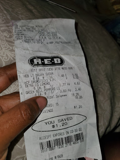 Read moreI shop at H-E-B in Copperas Cove because that’s the closest store to where I live. I am getting really aggravated with how the prices in H-E-B Cove are higher than the prices at both H-E-B’s in Killeen and the one in Harker Heights. But add insult to injury I sent my daughter to the store to get some shrimp. The shrimp was 597 a pound she was charged eight dollars, which is no problem if it’s actually over a pound. When I remove the shrimp from the bag and the wrap it was in I noticed it was under a pound before I even took it out the plastic so I decided to weigh it on my own scale and as expected, it was less than a pound but because they use different bags now, which are of thicker quality it makes it seem like it’s more than what it really is. I am so disappointed of whoever decided to take advantage of my daughter at the seafood section and of course they said that that’s not the case, but whatever I do reviews for good and bad services H-E-B in Copperas Cove is definitely becoming one of the worse grocers around here. I don’t like shopping at Walmart so I guess I’ll be driving even further to get my groceries now. I know my one review may not mean much to the stores, but this isn’t the first time I’ve complained or did a review about the store and the customer service of course nothing was done and nothing has changed but if I keep putting it out there, maybe someone might actually see it and decide something...