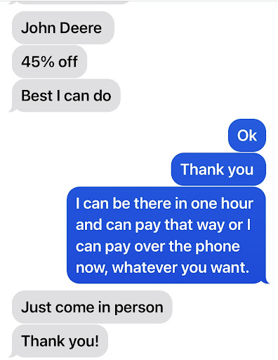 Read moreI was told there was a zero turn lawnmower waiting for me and I offered to pay over the phone before I even got there but I was told no it’s OK just pay for it when you get here. I got there and it was already sold to somebody else. I had to drive an hour just to get there and cancel my other appointments for the day so I can haul the mower home, just to finally get there and find out it was already sold after someone promised to hold it for me. They told me that they had one other John Deere zero turn mower that they could sell me but they wouldn’t even let me look at it .. because they didn’t like my “attitude.” They even stated that there’s no guarantee that the mower will work, trying to convince me not to buy it. I had every right to be disappointed that they sold the mower they promised me, after all the trouble I had to go throigh..These people are very unprofessional! (Chris is the only decent person there). Not worth the discounts! The statements in the response below are inaccurate. I clearly notified them that I was running late and was not informed that it would be sold to anyone else. God as my witness, I never made any threats. All I said was that an attorney would back me up that our text messages are considered a written/verbal contract. But I’m not going to go back-and-forth. It’s a shame that the employee’s inaccurate account takes precedence over my account of what happened, and this is the response that I get. All I know is I have the text messages to prove my story.This proves the lack of professionalism that I was...