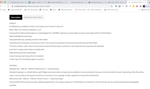 I ordered a table for 1,844.00 on November 30, 2020, at which point my payment was received in full. The product page, as seen in the below screenshot, noted that all items were made to order in 8-10 weeks. No indication was made that lead times would be longer than usual before or after I ordered.