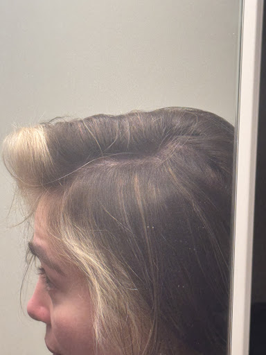 The worst part was the color. Emily left the root blend on too long, causing my scalp to burn and completely ruining my highlights. Even Chloe noticed something was wrong before Emily did. When she finally checked, she was shocked at how dark and orange my roots had become. Instead of properly fixing it, she applied more bleach to the front to try to cover it up and told me to "use purple conditioner" when I got home.