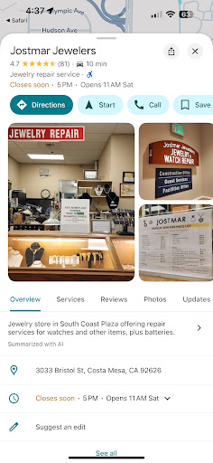 Read moreI had an old Omega watch that has a lot of sentimental value for me – it was given to me when my grandfather (who I was named after) passed a number of years ago. Over the past twenty years I have had the watch repaired, and it would shortly thereafter stop working again. After sending it to Omega (who sent it on to Switzerland), they came back saying that they no longer fixed this model. After stopping by the Omega store in South Coast, they referred me to Jostmar, owned by Joe. It was the best piece of advice I could have received! Being that the watch is at least 50 years old, there were not a lot of movements available. Joe was extremely persistent and patient, and after attempting multiple solutions over the course of over easily a year (I had no rush, I just wanted it to be working again), he was able to find a solution. Joe’s patient and persistence are old school – he is a man of his word, and a class act all the way around. Would highly recommend Joe (who has owned the store for over 20 years) and Jostmar – you will be in great “hands” –...