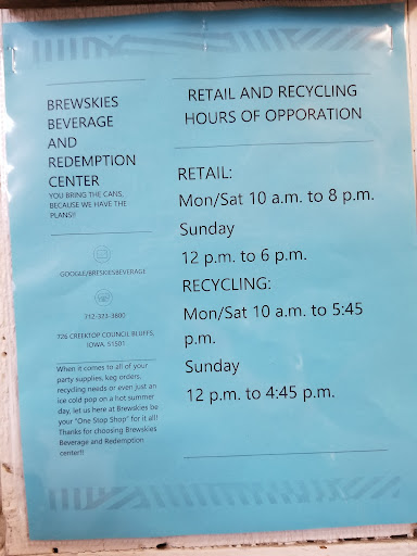Brewski's is the ONLY redemption center in Council Bluffs that takes unlimited amount of cans and bottles. The customer either has to flat out his/her cans/bottles. Or if they have ALOT of the same distributor, they will let you bag them up with a set number per bag. They will even provide the clear bags the distributor requires. The staff are very friendly and helpful, so if you are a newbie or just have any questions about how they want it done, just go ahead and ask. They even provide you with a list of Distributor Accepted cans and bottles so you can...