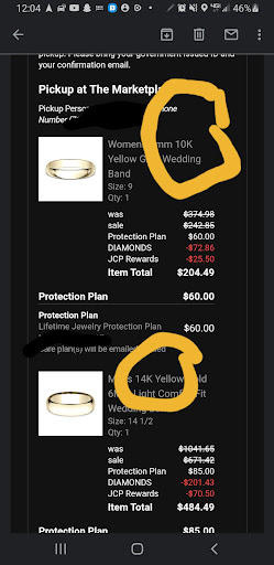 Read moreWent in last Sunday 3/28/2021 and ordered IN-STORE two wedding bands. Matching wedding bands as in appearance and alloy, 14k. After the order and I receive my email confirmation it says the woman's is 10k... Supposed to be both 14k. Would have happily paid the extra maybe $40 to get it right the first time. Not happy, being that I took a credit inquiry hit to acquire JCPenny' credit card to save an extra 15% for 24 hours only đĄđ€Ź.