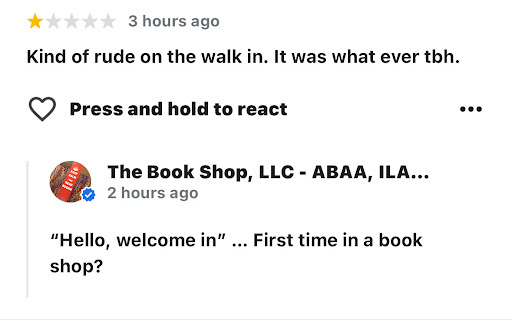 Read moreAs a bookseller your actions today disgusted me and literally sickened me to my stomach. I could never imagine treating a customer that came into my store like that. The Book Shop has been a child hood favorite of mine and every chance i get to return to the LA County I come. No more. No one was engaging in "horse play." Put the "antique" chair behind glass if it means that much to you. You sell books not chairs. its clear from your response and in store behavior that you do not care for community or for the comfort of those that enter into your store. More than that you yourself are a fraud. Bookstores and the books in them are about connection --- something you and your store are in need of. And God, "animated conversation on their cell phone" really?? God forbid someone answers their phone in an empty store. You wouldn't survive a day in any major city. You're lucky to be stuck in that dingy place in Covina of all places. Somewhere along the road you lost it man. You've got a lot to think about. Maybe just limit yourself to online sales. Ebay is a great a place I hear. There's no need for you to engage with the Covina community. You're a disgrace to the book...