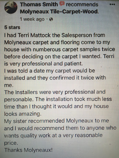 I worked with Terri the summer of 2019 to install carpet in 3 of my bedrooms. I told her the color scheme I was looking for and she brought samples to the in-home estimate. I didn’t feel like there were many options to choose from but I am happy with the option I chose. I was not home when the carpet was installed. When I came home there were rolls of carpet located in different areas of my home and there was dust and carpet fibers everywhere. It was a simple clean up and I was very happy with my carpet itself. Now, months later, the carpet is still good. I haven’t had any problems. You can see the areas that are the walked on the most but I think that’s because I chose a lower grade because that’s what I can afford. I recently reached out to Terri again to install luxury vinyl plank in the rest of my house. Unfortunately, it is completely out of my price range so I will most likely be having the same carpet I previously got. Terri has been very helpful by being patient and accommodating to my different request each time I have worked with her. I’m giving 4 stars because I do not like that you can’t go into the showroom and ask which options are more/less pricier as they are “based on the type of project”. Also, molyneaux does have a ton of discounts that you can use but I think the price is jacked up to begin with. So it seems like you are getting it cheaper. I say this because the first time I got an estimate I also received others from different companies but I chose molyneaux because of their timeframe to install the carpet. Terri has been a pleasure to work with and the products are...