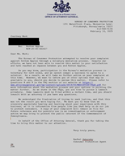 Ā Ā Ā Read moreRotten Apples is named appropriately because they are certainly rotten. Less than 30 days after my son paid them $470 to fix his Macbook screen, his screen turned black. Greg cited āaccidental damageā in his own opinion, which most certainly did not happen. They will not honor their 90 day warranty, and basically accused my son of lying when he told them he didnāt damage or drop it. They either sold him a piece-of-crap screen or provided crappy workmanship or both. Iām also seeing similar problems encountered by other customers on here. I strongly advise against using them and have filed a complaint with the state Attorney Generalās office.Updated 10/15/25 After reading Rotten Apples response to my review - I would like to add the following: #1) It makes absolutely no sense to claim that the screen crack occurred outside your store. My son noticed the screen crack at home and drove the computer to you. So are you implying that he drove a perfectly fine computer to you and then dropped it outside of your store before bringing it into your store to ask for a repair? That is a ridiculous claim to make! #2) Also I am attaching a screenshot of the letter from the attorney general. They stated that they can't force you to comply - they did not agree with you. #3) Their letter is dated for February yet you waited until October to reply. You did not just receive their response. #4. I'm also attaching photos of his laptop that you claim he dropped and damaged (which he did not). Please tell me where this damage appears? Your false claims just prove your...