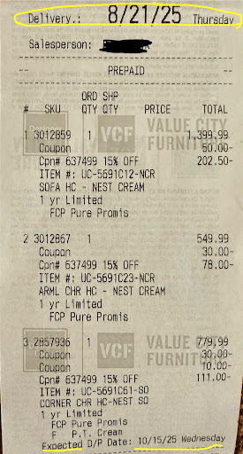 My receipt is specific, it doesn’t just say “estimated delivery,” it actually lists the armless chair as arriving August 21 along with the three person sofa. The item is already in their store, this isn’t a backorder or supply chain delay. It’s there and ready, but they’re holding it back for their own logistical convenience. I paid a $209.99 delivery fee, I have every right to expect that delivery would be done in the manner promised, not “bundled later because it’s easier for the company.”