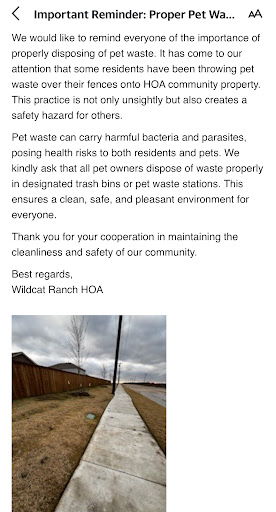 Beware. Homes are built fast and poorly. HOA will harass certain demographics and turn a blind eye to others. Owners of pets are allowing pets to roam freely and poop in yards. This seems to be an area for the retired population. Parents with young children/teenagers, look elsewhere. There’s no reserved, safe space for them. I inquired about a basketball court near the elementary school and found that the kids are no longer allowed to go there. There are no plans to add a designated area for the kids to enjoy such activities and get exercise, being that the board has declined the request, per the GM for Wildcat HOA. Adding a portable basketball goal in front of the home is dangerous due to traffic and the inclines that the development has been built on/made, also having to store it properly. I wish that I had this knowledge before choosing the area. Beware if you are thinking of living in this community and you have active kids. No reserved basketball or soccer court, only a playground for...