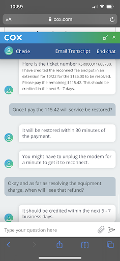 If zero was an option…. Absolute WORST service in my experience. I’ve lived in several states, several areas of Florida and cox is by far, the least professional, poorly experienced (in every way; customer service, tech, etc) and overall poorly managed company I’ve ever seen. We need internet for work and because of their inexperienced support team, we will have no connection for the next three days despite the fact our service was fine moments before our call to support. Now, we must wait 3 days to have a tech come out which is code for “extra money.” Our service was fine in terms of speed but about once or twice an hour we would lose connection for for a few minutes. We wanted to resolve that issue. Somehow, during the call, we were switched to an “upgraded” service which made our current modem useless. We asked for our service to be switched back immediately as waiting 3 days was not an option. “Support” told us since we were “upgraded” we couldn’t go back to our previous service. We did not ask to be upgraded. We simply wanted a connection that would be reasonably secure. The customer “service” rep was incredibly rude. I’ve never heard anyone speak to a Customer like she did. I’m not a Karen either. I’ve worked in customer service for over a decade and despite the fact I’m not the most social person on earth, I am an adult & balanced enough to make myself be friendly for the customer. As soon as she took our call she was rude. She knew exactly what the problem was yet somehow, had zero clue how to explain it. The only thing she could think to say was “it’s confusing.” Confusing for who exactly? You? You know nothing of my experience, knowledge or training so at the very least, humor me and see if I can comprehend the problem. Let me be the one to decide if it’s “confusing.” She simply would say nothing but “it’s confusing” and “you’ll need a tech.” We had internet connection this entire time until she made some change and now there’s no way to connect us? How does that make sense? I could live with this situation if she’d been professional but she was the farthest thing from professional. Rude, immature and emotional are the words that come to mind with her. She seemed to be putting an unwarranted amount of emotion into the situation when all that was needed was strait-forward, professional assistance. So quick to sell us an unnecessary tech call and refused to simply put her thinking cap on and help….or at least connect us to someone else in the department who may be having a less emotional day. Leave your emotions at home and try to work on being a...