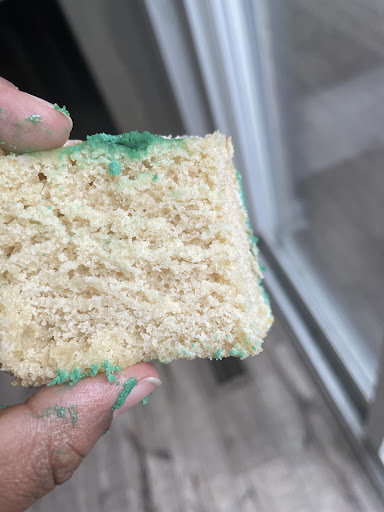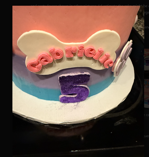 The pastel, muted colors clashed with the bold theme I requested, and the paw prints and bone decorations were minimal and poorly done. Skye and Everest, who were supposed to be the focus of the theme, weren’t incorporated thoughtfully, even as edible toppers. To make things worse, the glittery “5” was applied unevenly and looked hastily added, giving the cake an overall sloppy and unfinished appearance. The cake itself was extremely hard, as if it had been frozen, and the fondant was off in both texture and flavor, which added to the disappointment.