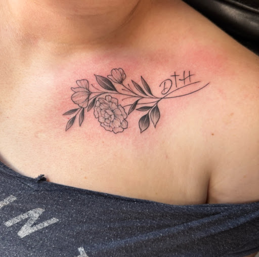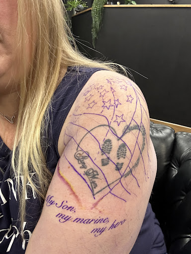 Needless to say, we both booked an appointment within a few weeks of our initial visit. When the time came for my appointment, I was super excited to expand on my existing tattoo in honor of my son who is an active Marine. I had envisioned a flag going through the heart with the words, "My Son, my marine, my hero". Mike drew it up and printed the stencil which was a very rough sketch of what the final product would be (see images). He began by positioning the stencil on my arm and allowed me to live stream the process on TikTok while he worked! His tattoo machine itself was super quiet for those with sensory/auditory issues or sheer panic or anxiety! Three hours + later we had a finished product and I couldn't have been happier with the results. His work is amazing and everyone was super friendly and down to earth. I will definitely...