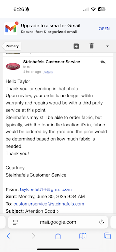 UPDATE: So we never got the credit we were promised by Noelle. Steinhafels needs to train personnel. This is lying to get a sale. Pretty sure it is illegal. On another note, I have called customer service 3 times about our custom order chair. Noelle, the salesperson has yet to return a callback. I purchased 2 of the same chair but one was a custom fabric order. This week we took the furniture out of storage, and noticed that the chairs have 2 different leg styles and heights. My feet don’t even reach the floor with the custom chair. And to top it one leg is actually for the left side, as you can see the counter sunk hole if it is turned the correct direction. I am so glad we purchased our Aireloom mattress elsewhere. I don’t want this horrible, inadequate company to make more profit from me.