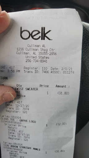 Read moreI went into Belks tonight to buy some makeup and it is definitely the last trip to this location I'll ever make. They closed at 9. I went in about 25 min to 9 and I saw 3 sales people in the whole store. One was a young guy that nearly ran me over in the walking area because he chose to walk on his left side which was my right side. I stopped to keep him from running me over and he just stopped and stood there glaring at me until I finally went to the wrong side to let him by. He never spoke. Unexcusable rudeness. Then I got to the makeup counter and kept standing there. After about 5 minutes, a saleslady went behind the counter, was standing nearly in front of me and started closing out the drawer. I kept standing there and she just kept ignoring me. I decided that they sell makeup a lot of places and obviously, Belk in Cullman didn't want my business. So I went back to my car and left....