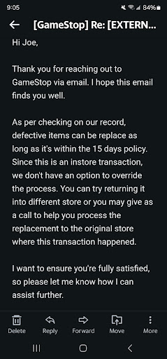 Read moreI've been going to this establishment for 14 years and other than minor issues I've never had a real issue. Until my last visit. I went in to buy a controller for my ps5 and knowing how I've got burnt on used things in the past I decided to buy new. I denied the 16 dollar 1 year warranty because of how expensive the controller already was , plus if it was defected I could just bring it in and exchange it or so I thought! Got home unboxed it and quickly felt how defaulted the controller was. I boxed it back up and waited the next day to take it back since they were already closed for the day! Took it back the next day with receipt and the sales associate told me he didnt see or feel anything wrong with it and since I bought it new I couldn't exchange it (store policy), but if I had bought it used they're wouldn't be an issue. Said he'd gladly give me 42 dollars store credit. Whaaaat? Mind you i just bought it less than 24 hours. I said nope and emailed gamestop. This was they're reply. Not driving 45 minutes out of my way. So they got me for the last time. Been using gamestop for 25 years...