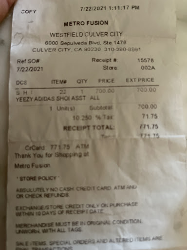 This store does very shady business. I asked if they had a pair of yeezy 350 v2 cinder reflective adidas size 11. They said they could order them, price $771. They had me try on a pair of other yeezys to check size and I said ok and paid. They gave me a receipt and said I could pick them up in a week. When I got home and looked at the receipt I noticed it just said adidas yeezy shoes. Thatās odd. So I call Mohamed back and ask about the receipt and why thereās no description. I come to find out they had ordered non reflective yeezys and I should have known that. I said politely that thatās not what I ordered or paid for and I need to cancel that order as that is well over the price of reflective and more than double for non reflective. He said that they donāt do refunds. I reminded him of the deceptive description of the shoe, the price discrepancy , the fact that I didnāt have them even yet and he kept up with the no refunds scam. My attempts to be courteous and cancel the order after the attempted scam were only that. A courtesy. This is blatant false advertising and deceptive practice, which any bank will overturn. Mohamed was sticking to his scam that I could only get store credit. I would never buy anything in that store again. Nor should anyone who respects themselves. Anyway now they can deal with my bank dispute and subsequent report to the bbb, dun and Bradstreet, and Rob Banto at The Los Angeles district attorneyās office division of consumer protection where a complaint was filed. No one wants to do business with people who try to trick you into buying something other than you paid for and expect. I hope they get shut down soon or enough people see this and they go out of business. Soon. Disgusting business ethics. Canāt you make money without scamming people? Apparently metrofusion cannot. Avoid...